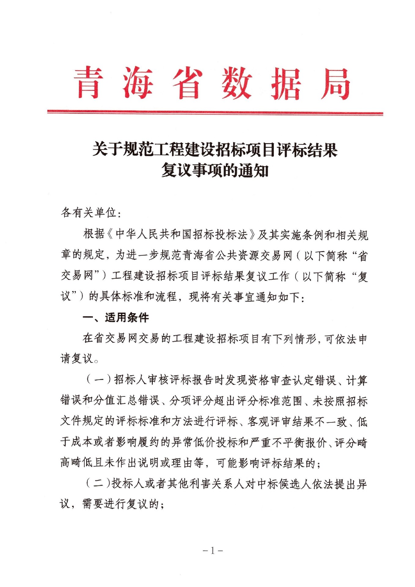 青海国德招标代理有限公司转发青海省数据局关于规范工程建设招标项目评标结果复议事项的通知