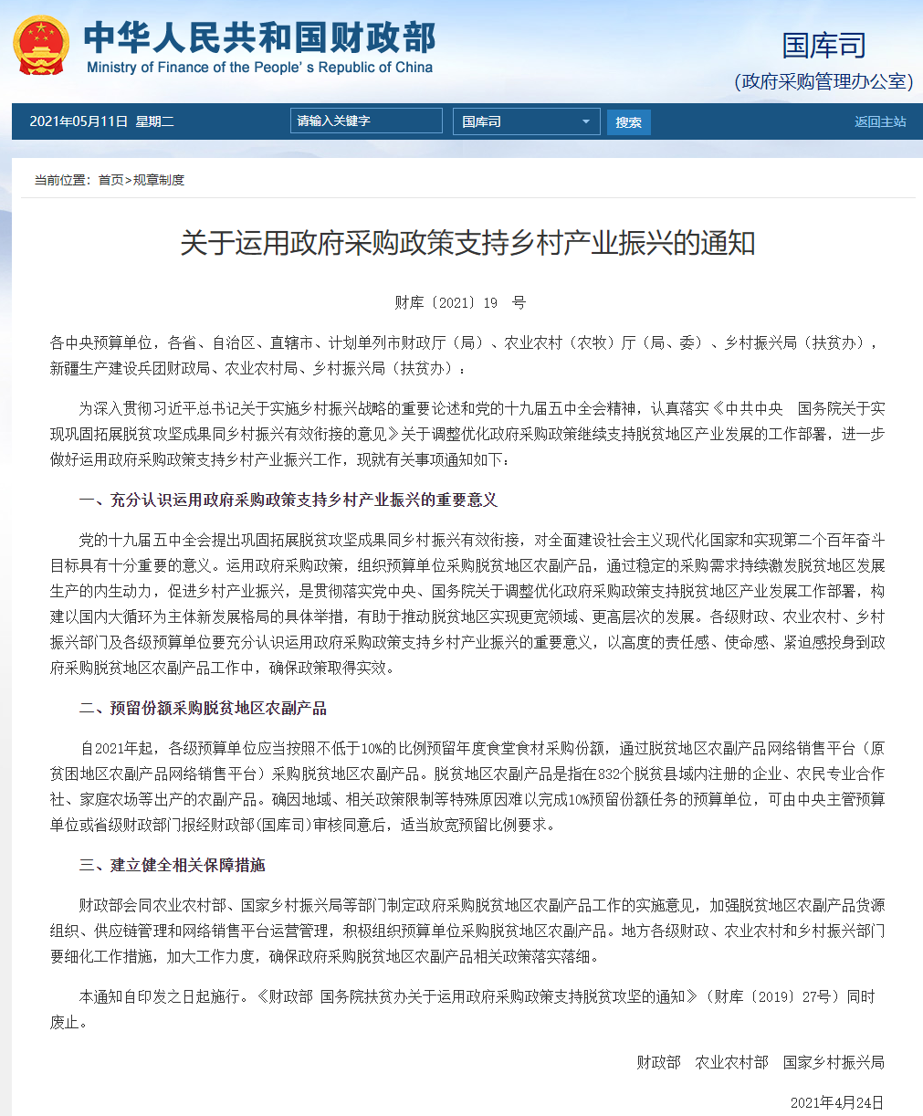 关于运用政府采购政策支持乡村产业振兴的通知财库〔2021〕19 号 各中央预算单位,各省、自治区、直辖市、计划单列市财政厅(局)、农业农村(农牧)厅(局、委)、乡村振兴局(扶贫办),新疆生产建设兵团财政局、农业农村局、乡村振兴局(扶贫办): 为深入贯彻习近平总书记关于实施乡村振兴战略的重要论述和党的十九届五中全会精神,认真落实《中共中央 国务院关于实现巩固拓展脱贫攻坚成果同乡村振兴有效衔接的意见》关于调整优化政府采购政策继续支持脱贫地区产业发展的工作部署,进一步做好运用政府采购政策支持乡村产业振兴工作,现就有关事项通知如下: 一、充分认识运用政府采购政策支持乡村产业振兴的重要意义 党的十九届五中全会提出巩固拓展脱贫攻坚成果同乡村振兴有效衔接,对全面建设社会主义现代化国家和实现第二个百年奋斗目标具有十分重要的意义。运用政府采购政策,组织预算单位采购脱贫地区农副产品,通过稳定的采购需求持续激发脱贫地区发展生产的内生动力,促进乡村产业振兴,是贯彻落实党中央、国务院关于调整优化政府采购政策支持脱贫地区产业发展工作部署,构建以国内大循环为主体新发展格局的具体举措,有助于推动脱贫地区实现更宽领域、更高层次的发展。各级财政、农业农村、乡村振兴部门及各级预算单位要充分认识运用政府采购政策支持乡村产业振兴的重要意义,以高度的责任感、使命感、紧迫感投身到政府采购脱贫地区农副产品工作中,确保政策取得实效。 二、预留份额采购脱贫地区农副产品 自2021年起,各级预算单位应当按照不低于10%的比例预留年度食堂食材采购份额,通过脱贫地区农副产品网络销售平台(原贫困地区农副产品网络销售平台)采购脱贫地区农副产品。脱贫地区农副产品是指在832个脱贫县域内注册的企业、农民专业合作社、家庭农场等出产的农副产品。确因地域、相关政策限制等特殊原因难以完成10%预留份额任务的预算单位,可由中央主管预算单位或省级财政部门报经财政部(国库司)审核同意后,适当放宽预留比例要求。 三、建立健全相关保障措施 财政部会同农业农村部、国家乡村振兴局等部门制定政府采购脱贫地区农副产品工作的实施意见,加强脱贫地区农副产品货源组织、供应链管理和网络销售平台运营管理,积极组织预算单位采购脱贫地区农副产品。地方各级财政、农业农村和乡村振兴部门要细化工作措施,加大工作力度,确保政府采购脱贫地区农副产品相关政策落实落细。 本通知自印发之日起施行。《财政部 国务院扶贫办关于运用政府采购政策支持脱贫攻坚的通知》(财库〔2019〕27号)同时废止。 财政部 农业农村部 国家乡村振兴局 2021年4月24日