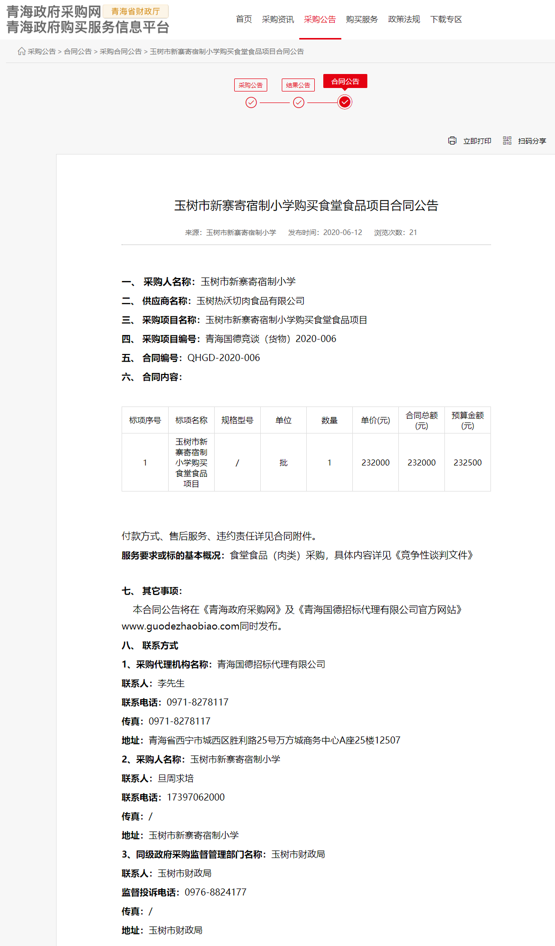 玉树市新寨寄宿制小学:购买食堂食品项目