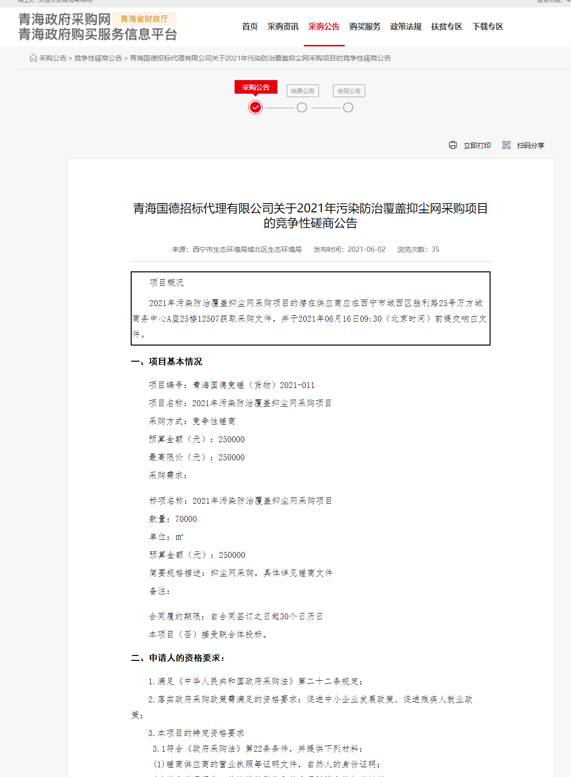 西宁市生态环境局城北区生态环境局:2021年污染防治覆盖抑尘网采购项目